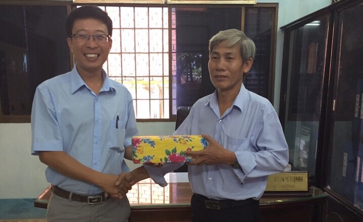 Thầy Đinh Văn Trịnh - Hiệu trưởng nhà trường chúc mừng thầy Việt Hùng - nhân viên Y tế